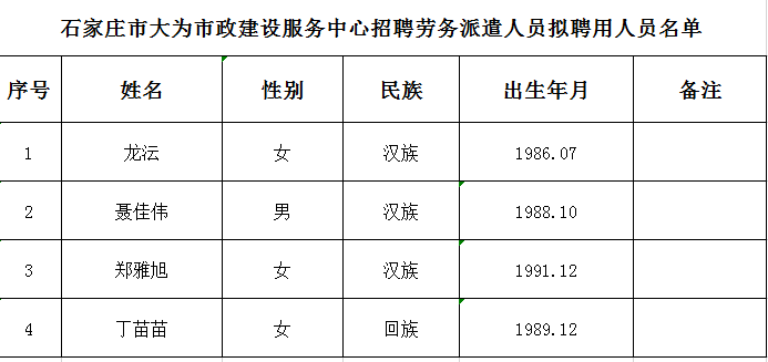 石家莊市(shì)大爲市(shì)政建設服務中心招聘勞務派遣人(rén)員拟聘用人(rén)員名單